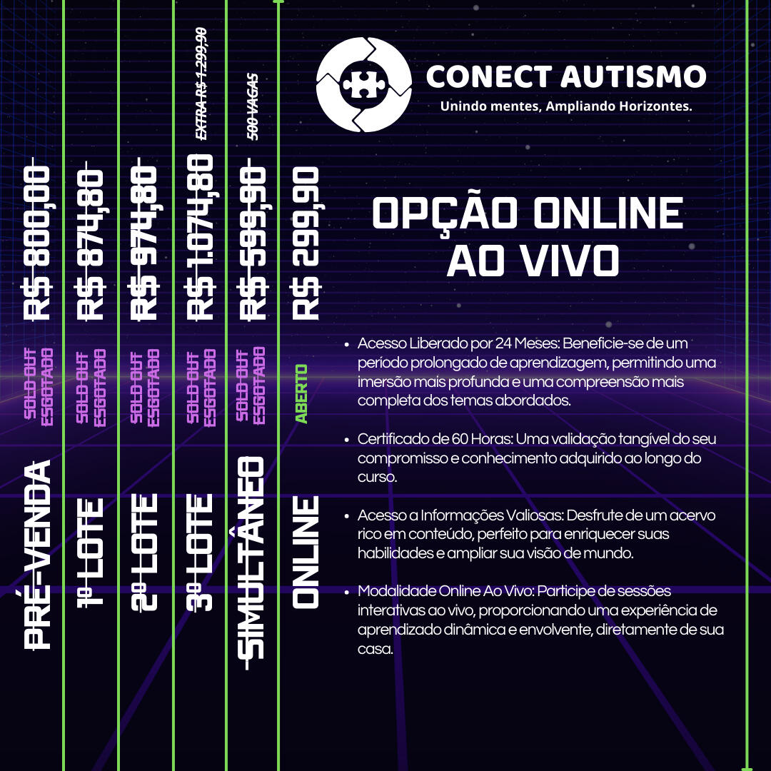 Políticas de Cancelamento, Acesso e TransferênciaCancelamentos e Reembolsos: Seguimos estritamente o Código de Defesa do Consumidor (Lei nº 8.078/1990, Art. 49), aceitando cancelamentos e solicitações de reembolso até 7 dias após a compra. Passado este prazo, não será possível realizar cancelamentos ou reembolsos devido aos compromissos operacionais e sociais assumidos.Acesso ao Congresso: Asseguramos que o acesso ao conteúdo será disponibilizado remotamente por 24 meses, tanto para quem optar por não participar presencialmente quanto para todos os participantes, garantindo a flexibilidade e comodidade de todos.Transferência de Titularidade: A política do evento proíbe a transferência de titularidade dos ingressos, visando a organização e a segurança do evento, conforme as normativas aplicáveis.Responsabilidade por Desistência: Não nos responsabilizamos por desistências ou não participações resultantes de decisões pessoais ou erros na compra. Recomendamos atenção no processo de compra, pois, dentro do prazo legal, é possível solicitar o reembolso integral.Modalidades de IngressosPresencial Completo: Acesso a todas as atividades e conteúdos, incluindo conteúdo gravado disponível por 24 meses.Presencial Simultâneo: Benefícios do presencial, mais transmissão ao vivo em sala adjacente.Ingresso Online: Participação ao vivo e acesso ao conteúdo gravado por 24 meses.Festa Pré-Conect: Acesso exclusivo à festa em 23 de Agosto de 2024, com jantar e show.Política de CuponsA utilização de cupons de desconto está sujeita à responsabilidade integral do congressista, tanto em sua aplicação quanto em sua utilização. É imprescindível que o congressista aplique o cupom de desconto no ato da compra, verificando e confirmando o valor final antes de concluir a transação. Esta medida assegura que o benefício do desconto seja corretamente aplicado e reconhecido no processo de compra.Cupons: Exitem vários a responsabilidade de utilização é total do congressista, em sua aplicação e utilização, que deve ser feita no ato da compra, confirmando o valor é compra.Políticas e Informações ImportantesConteúdo e Acesso Online: O evento ao vivo e o conteúdo gravado serão disponibilizados online por 24 meses, com certificação de participação.Seleção do Ingresso e Meia-Entrada: Regulamentada pelo Estatuto da Juventude (Lei nº 12.852/2013) e pelo Estatuto do Idoso (Lei nº 10.741/2003), exigindo documentação comprovatória.Compromisso com Causas Sociais: Apoiamos iniciativas significativas para o avanço no tratamento e compreensão do autismo.Suporte ao Participante: Disponibilizamos canais de suporte para resolver dúvidas ou problemas.Compras em Grupo: Oferecemos descontos para compras de cinco ou mais ingressos.Reforço LegalEm conformidade com o Código de Defesa do Consumidor, estabelecemos regras específicas para assegurar o bom andamento e a segurança do evento. As políticas, incluindo a proibição de transferência e revenda de ingressos, são comunicadas claramente a todos os participantes.Presença de Palestrantes e Experiência do ParticipanteNos comprometemos com a qualidade do evento e uma gestão adequada das mudanças na agenda, assegurando a melhor experiência para todos.Objetivo do EventoO Conect Autismo 2024 tem como missão oferecer uma experiência educativa e inspiradora, focada na qualidade, segurança e impacto social positivo. Agradecemos sua participação e apoio nesta jornada significativa.Atenciosamente,Equipe Conect Autismo 2024